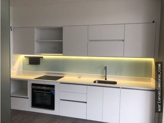 -Cocina integrada con sobre de cuarzo, plantilla y horno empotrado