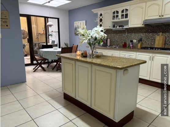 - Cocina con sobre de granito, ante comedor y salida al jardín.